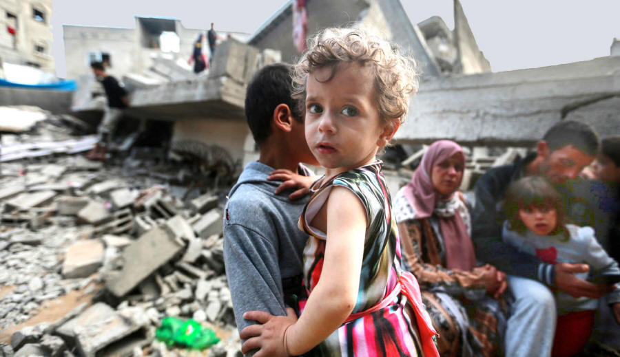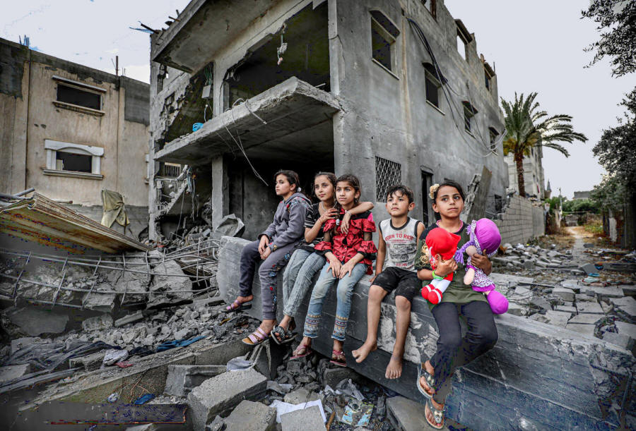 Palästinensische Kinder sitzen auf den Trümmern ihres Hauses in Deir al-Balah, im zentralen Gazastreifen, nachdem es am 13. Mai durch einen israelischen Luftangriff zerstört wurde. - Abdelrahman Alkahlouf |