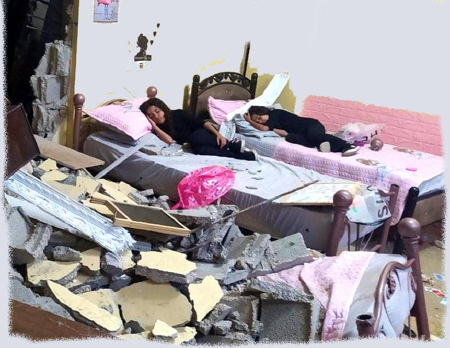 Veröffentlicht Fotos seiner beiden Töchter, die auf den Ruinen seines zerbombten Hauses schlafen. |