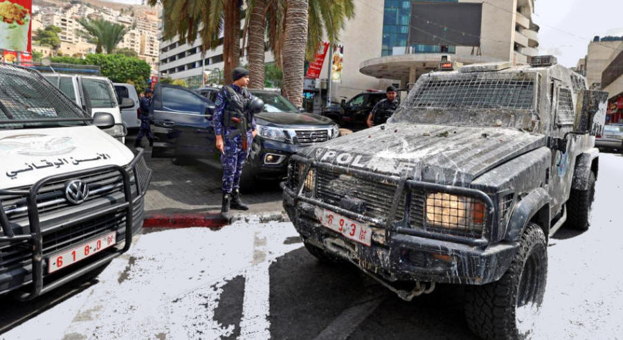 Palästinensische Sicherheitskräfte stehen Wache, als in der besetzten Stadt Nablus im Westjordanland wieder Ruhe einkehrt, nachdem es am Vortag zu Zusammenstößen zwischen Demonstranten und palästinensischen Sicherheitskräften gekommen war, am 21. September 2022