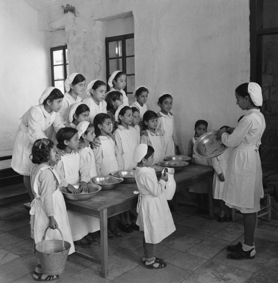 Palästinensische Schülerinnen nahmen 1945 in einem Sommerlager in Jerusalem an einer Unterrichtsstunde zum Thema Geschirrspülen teil. :-) |